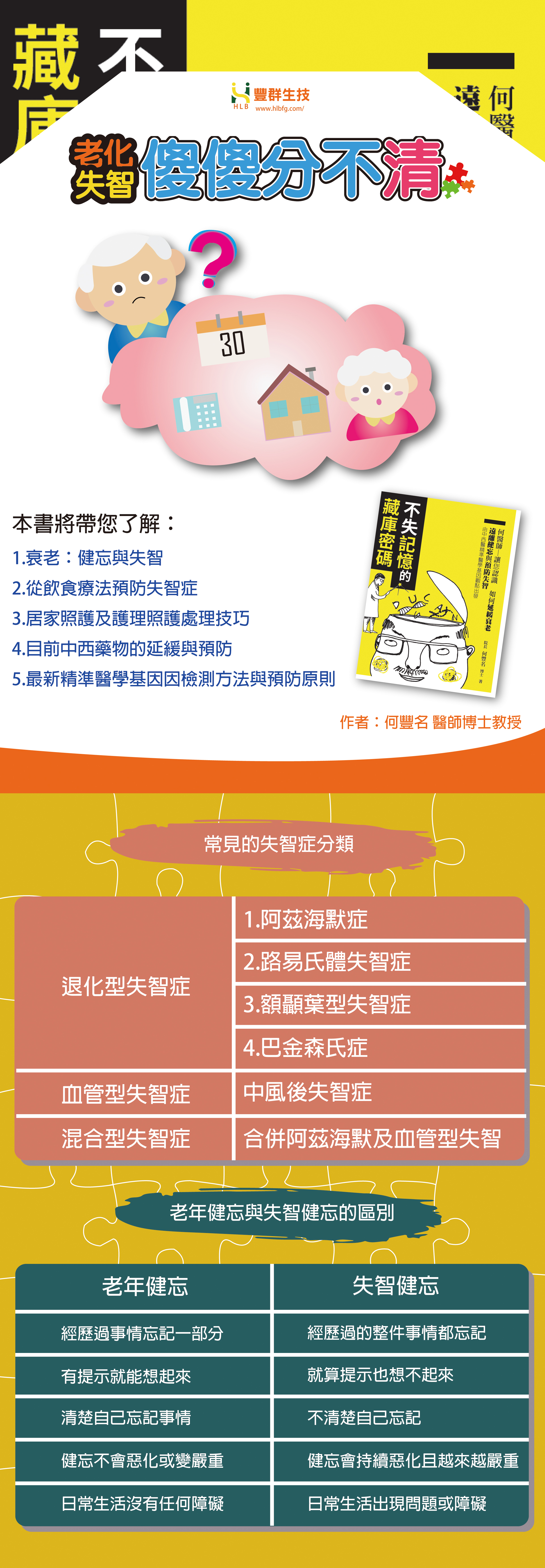 作者何豐名執行長/教授,為台大醫學博士,擁有中西醫師資格且為分子生物學專家,他將醫師的專業訓練,配合30年醫療執業累積的經驗,並把學術研究的成果從實驗室轉為臨床上的實際應用而完成本書,教導你如何調控日常生活飲食、運動,並認識中西醫有關增進健康、預防衰老及失智症的良方,深入簡出、精簡扼要,是一般民眾防老、健康、解惑及實踐的寶典。