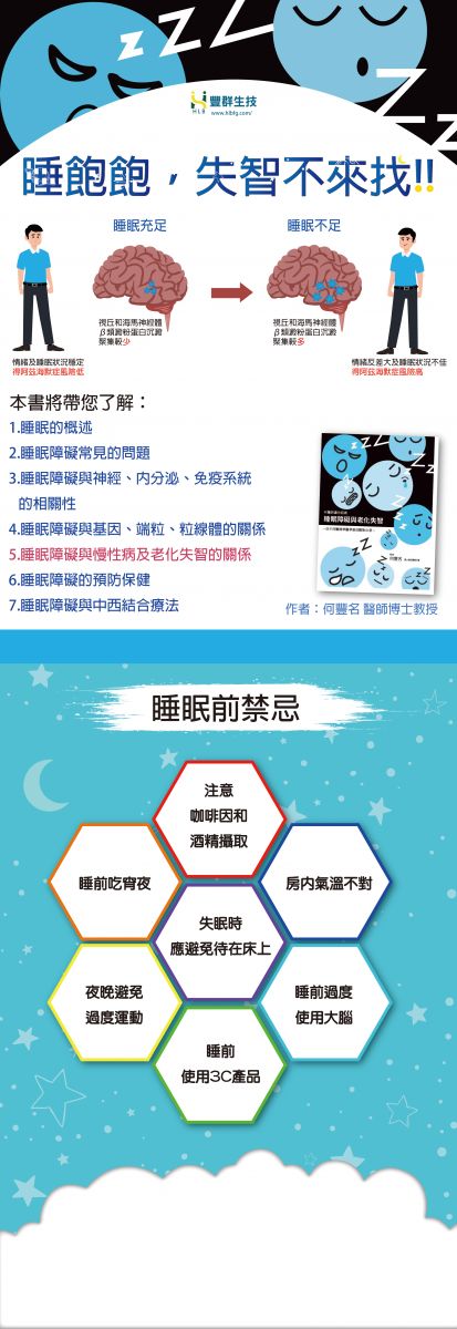然而,睡眠障礙的發生常與情緒、內分泌、免疫力及動脈硬化、脂肪肝、腦神經傳導、動脈硬化等問題的發生,有著密切的相關性。而這些相關問題,也常引發許多疾病,如肥胖、高血脂、高血壓、糖尿病、心臟衰竭、精神官能症,甚至癌症的發生,而這些慢性疾病的出現,又會加速老化及失智的進行;另外,具有睡眠障礙的民眾也常因服用安眠藥,這些情況也會加速促進老化與失智的進行。
