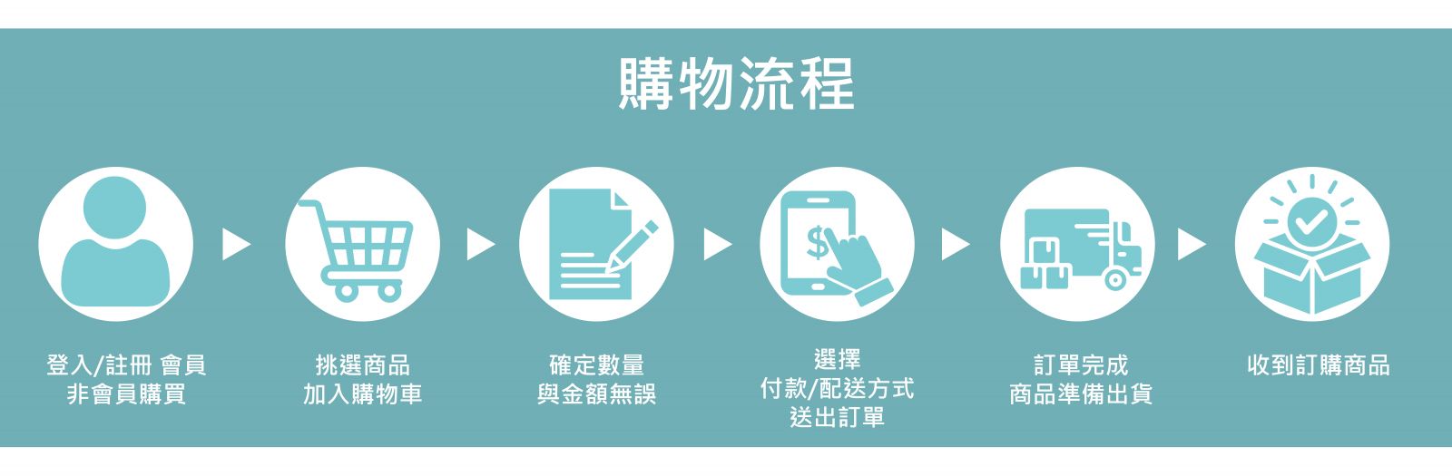 登入/註冊會員或非會員購買 > 選購商品 > 加入購物車結帳 > 確定數量與金額無誤 > 填寫付款方式 > 送出訂單 > 訂購完成
